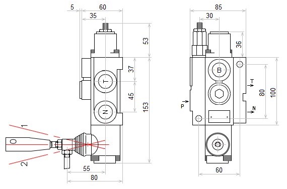 Hidraulikus elosztó alapvető méreteit bemutató rajz: