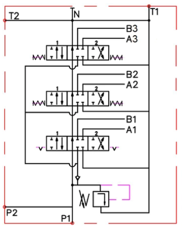 3-szekciós hidraulikus elosztó 40L 2x kettős működésű 1x reteszes szekció hidraulikus motor vezérléséhez