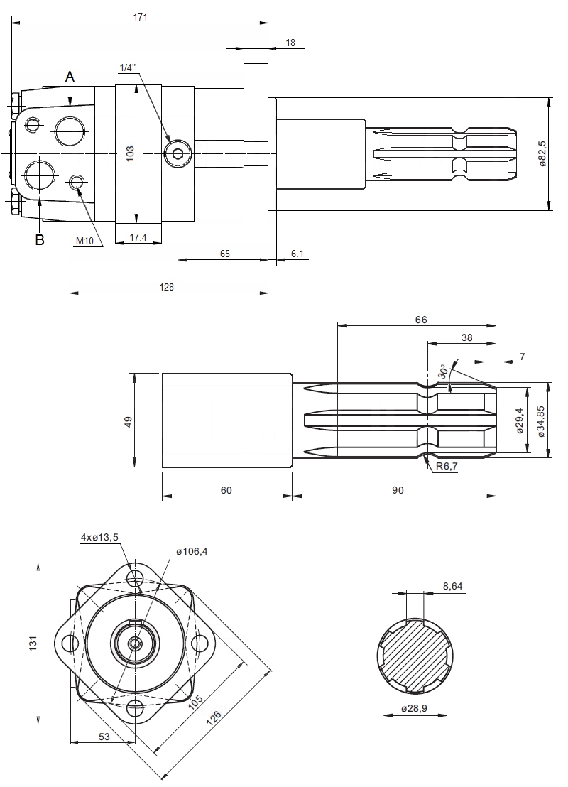 A hidraulikus motor alapvető méreteit ábrázoló rajz: