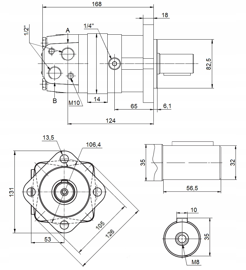 A hidraulikus motor alapvető méreteit ábrázoló rajz: