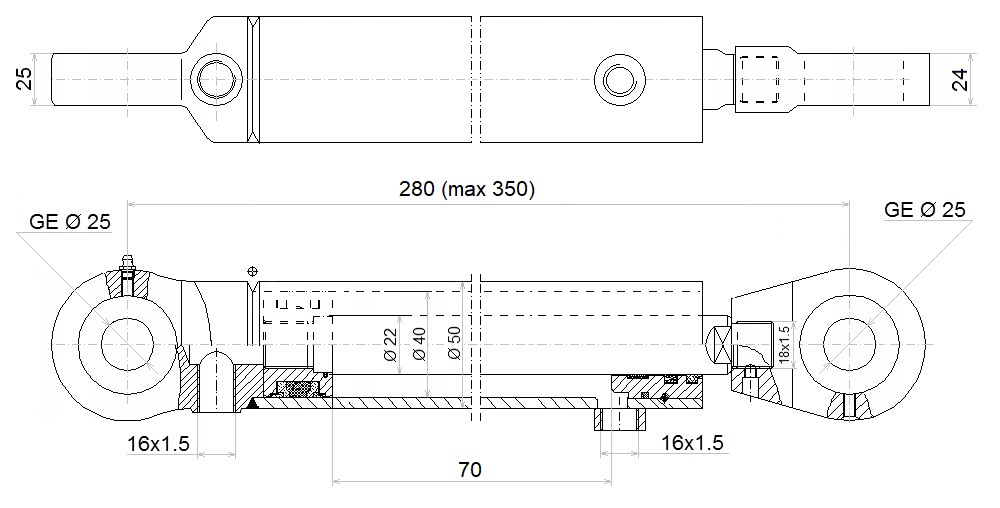 Kettős működésű hidraulikus munkahenger 40/22, hossz: 280mm lökethossz: 70mm