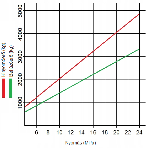 A munkahenger kinyomó- és behúzóerő változását a hidraulikus rendszerben uralkodó olajnyomás függvényében bemutató táblázat: