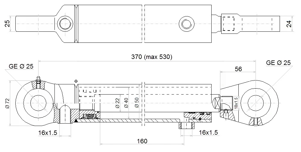 Kettős működésű hidraulikus munkahenger 40/22, hossz: 370mm lökethossz: 160mm