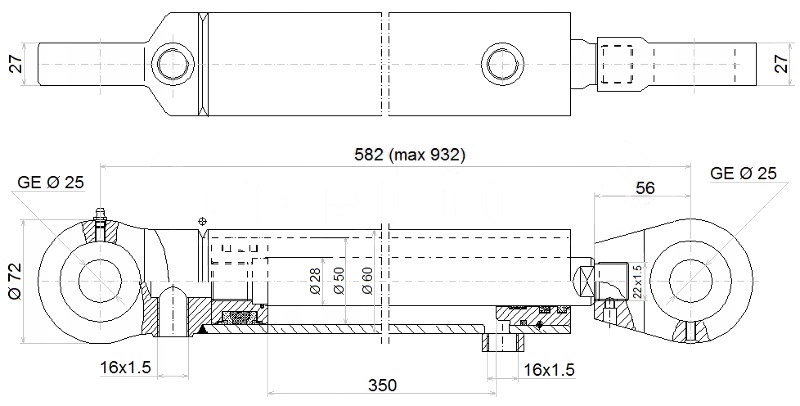 Kettős működésű hidraulikus munkahenger 50/28, hossz: 582mm lökethossz: 350mm
