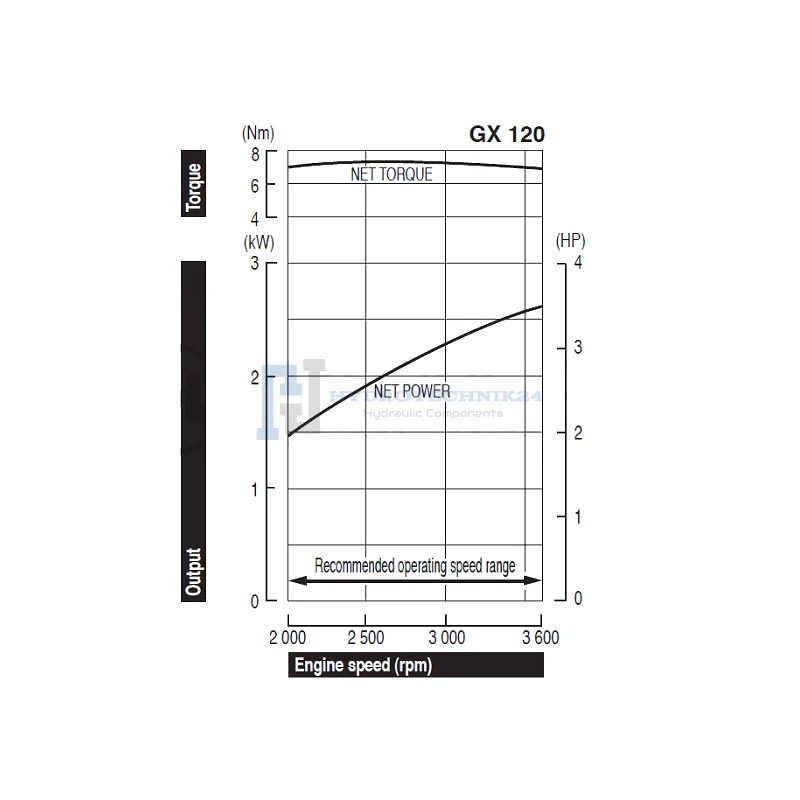 - Maximális teljesítmény: 2,6 kW (3,5 LE) / 3600 ford./perc