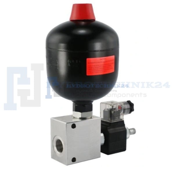 Membrános 1 literes, 24V-os elektromos leválasztó szeleppel ellátott hidraulikus akkumulátor. Töltési nyomás a szerint választás