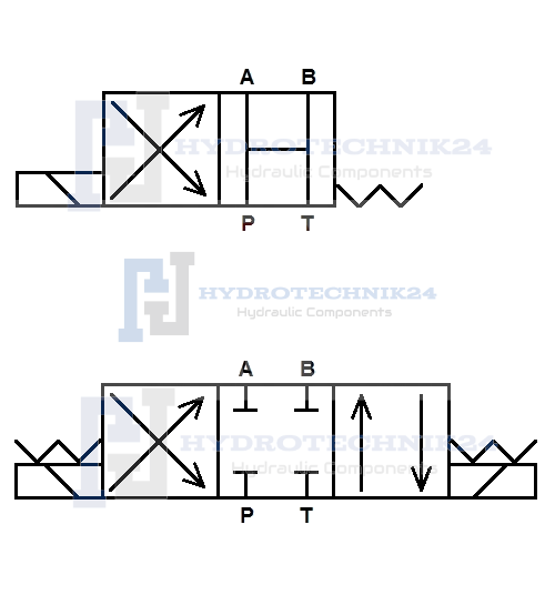 - Zéró pozíció 0 (mindkét elektromágnes tekercs tápellátása megszakítva), a hidraulikus henger dugattyúja álló helyzetben van - az olaj a túlfolyóba áramlik.