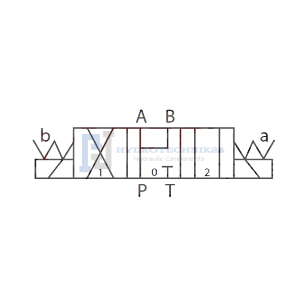 - Konfiguráció: két tekercs 12V DC, szelep csúszka 3-pozíciójú típus M, rugóval alaphelyzetben rögzítve