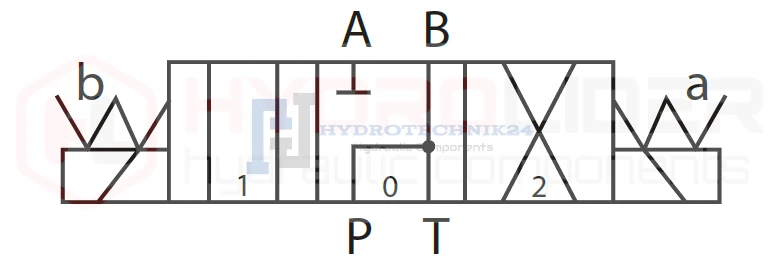 - Konfiguráció: két tekercs 12V DC, szelep csúszka 3-pozíciójú típus P, rugóval alaphelyzetben rögzítve