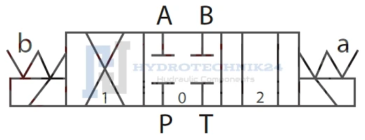 - Konfiguráció: két tekercs 24V DC, szelep csúszka 3-pozíciójú típus E, rugóval alaphelyzetben rögzítve