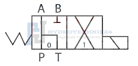- Konfiguráció: egy tekercs 24V DC, szelep csúszka 2-pozíciójú típus FB, rugóval alaphelyzetben rögzítve