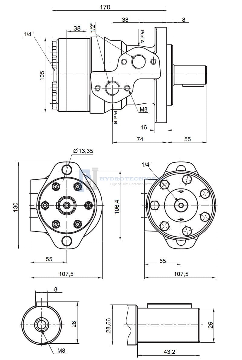 Hidraulikus motor BMR, folyadékszállítás: 200cm3/ford. fordulatszám: 300ford./perc tengely: 25mm, tengelyre szerelt hüvellyel, sarok szerelőlemez