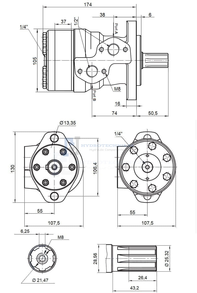 Hidraulikus motor BMR folyadékszállítás: 200cm3/ford. fordulatszám: 300ford./perc tengely: SAE 6B 1"
