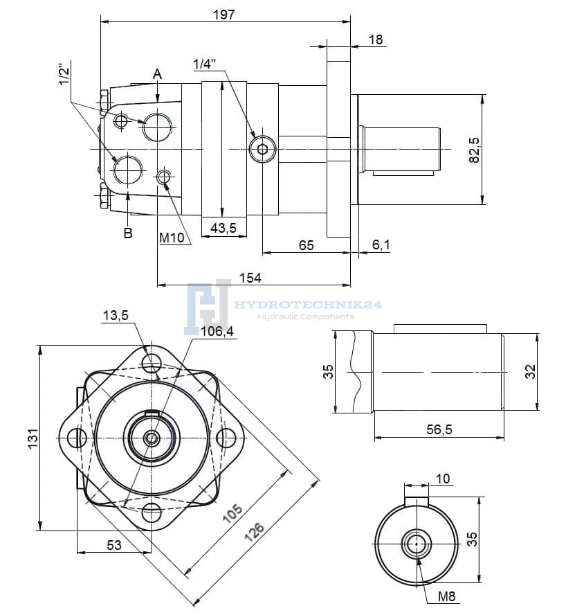 SMS Hidraulikus motor, folyadékszállítás: 250cm3/ford. fordulatszám: 310ford./perc tengely: 32mm. Sarok szerelőlemez