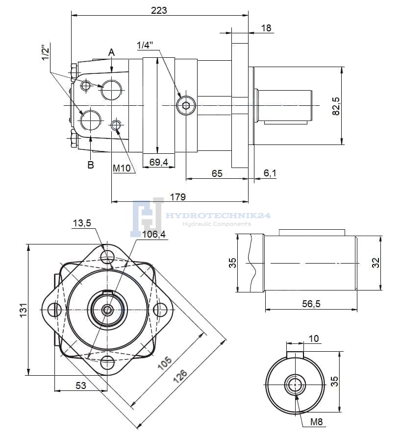 SMS Hidraulikus motor, folyadékszállítás: 400cm3/ford. fordulatszám: 190ford./perc tengely: 32mm. Tengelyre szerelt hüvellyel