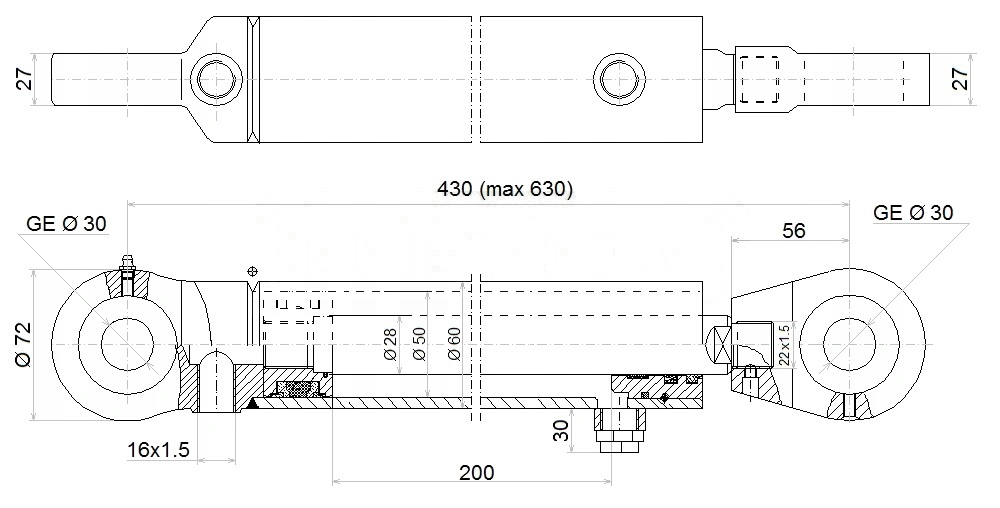 Egyszeres működésű hidraulikus munkahenger 50/28, hossz: 430mm lökethossz: 200mm