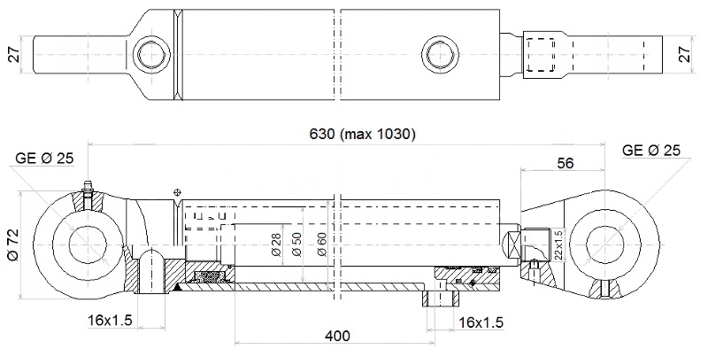 Kettős működésű hidraulikus munkahenger 50/28, hossz: 630mm lökethossz: 400mm biztonsági szeleppel „zárral”