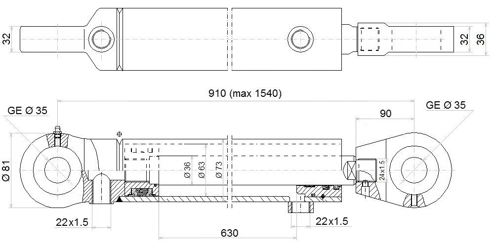 Kettős működésű hidraulikus munkahenger 63/36, hossz: 910mm lökethossz: 630mm biztonsági szeleppel „zárral”