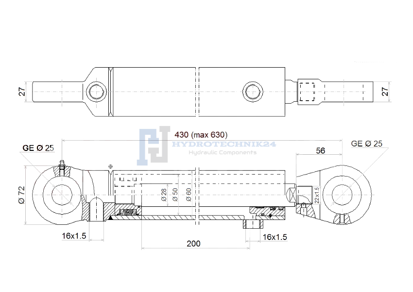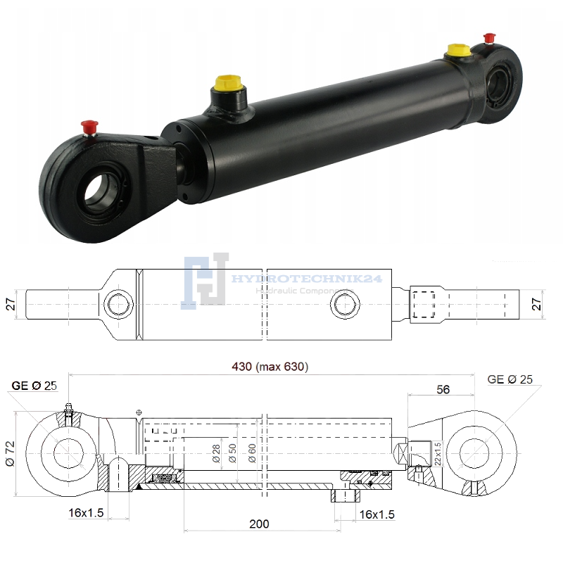 Kettős működésű hidraulikus munkahenger 50/28, hossz: 430mm lökethossz: 200mm