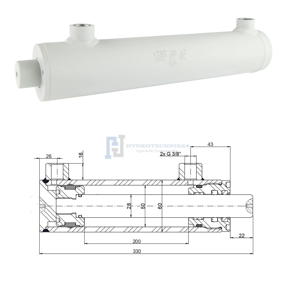 Kettős működésű hidraulikus munkahenger 50/28, lökethossz: 200mm, rögzítés nélküli standard