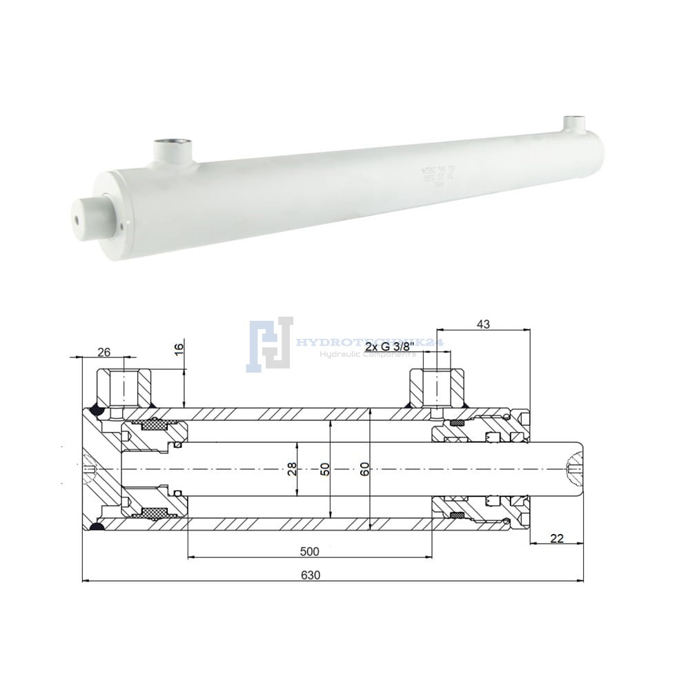 Kettős működésű hidraulikus munkahenger 50/28, lökethossz: 500mm, rögzítés nélküli standard