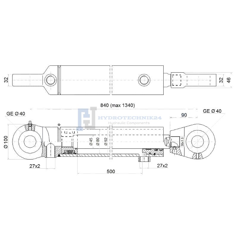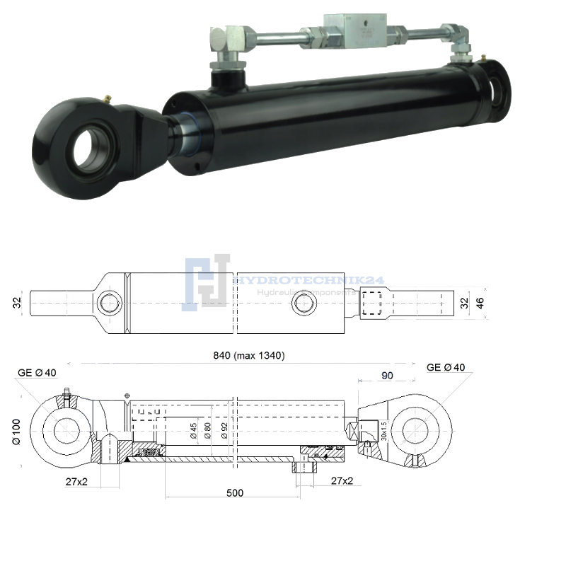 Kettős működésű hidraulikus munkahenger 80/45, hossz: 840mm lökethossz: 500mm biztonsági szeleppel „zárral”