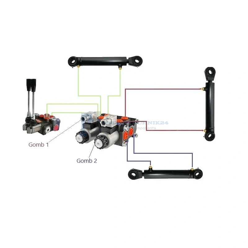 - Példa vezérlésre: három egymástól függetlenül működő kettős működésű henger, amelyet egy hidraulikus elosztószelep.