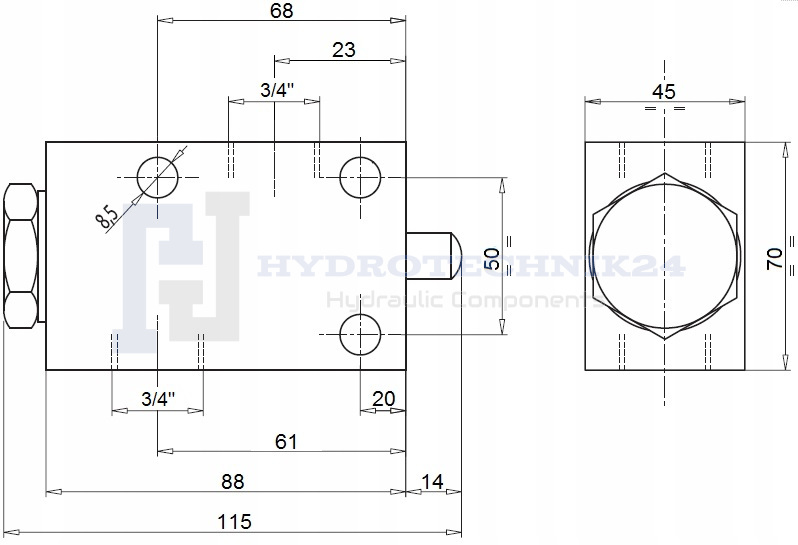 Nyomott végszelep „végálláskapcsoló” alaphelyzetben zárt VF-NC V-201 menetek: 3/4” térfogatáram: 100L maximális nyomás: 350bar