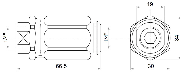 VRB hordós szelep állítható fojtószeleppel kétoldalon, menetekkel: 1/4”, térfogatáram: 20L/perc, maximális nyomás: 300bar