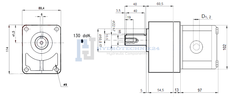 2. csoportba tartozó hidraulikus fogaskerekes szivattyú, bal irányú, űrtartalom: 14cm3/ford., teljesítmény (1500ford/perc): 21L/perc, csapágykarimával ellátva
