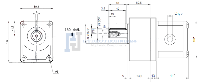 2. csoportba tartozó hidraulikus fogaskerekes szivattyú, jobb irányú, űrtartalom: 22cm3/ford., teljesítmény (1500ford/perc): 33L/perc, csapágykarimával ellátva