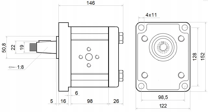 A hidraulikus szivattyú alapvető méreteit bemutató rajz: