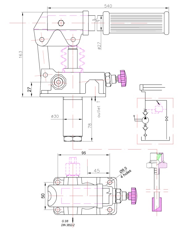 A szivattyúból egy olajtömlő áll ki (a fényképen fedőelemmel látható), melyek lehetővé teszik egyszeres működésű henger csatlakoztatását. A szivattyú nagyszerűen együttműködik a kínálatunkban megtalálható mindegyik Hydrotechnik24 márkájú egyszeres működésű munkahengerrel.
