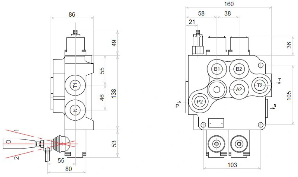 2-szekciós hidraulikus elosztó 80L 1x kettős működésű 1x egyszeres működésű