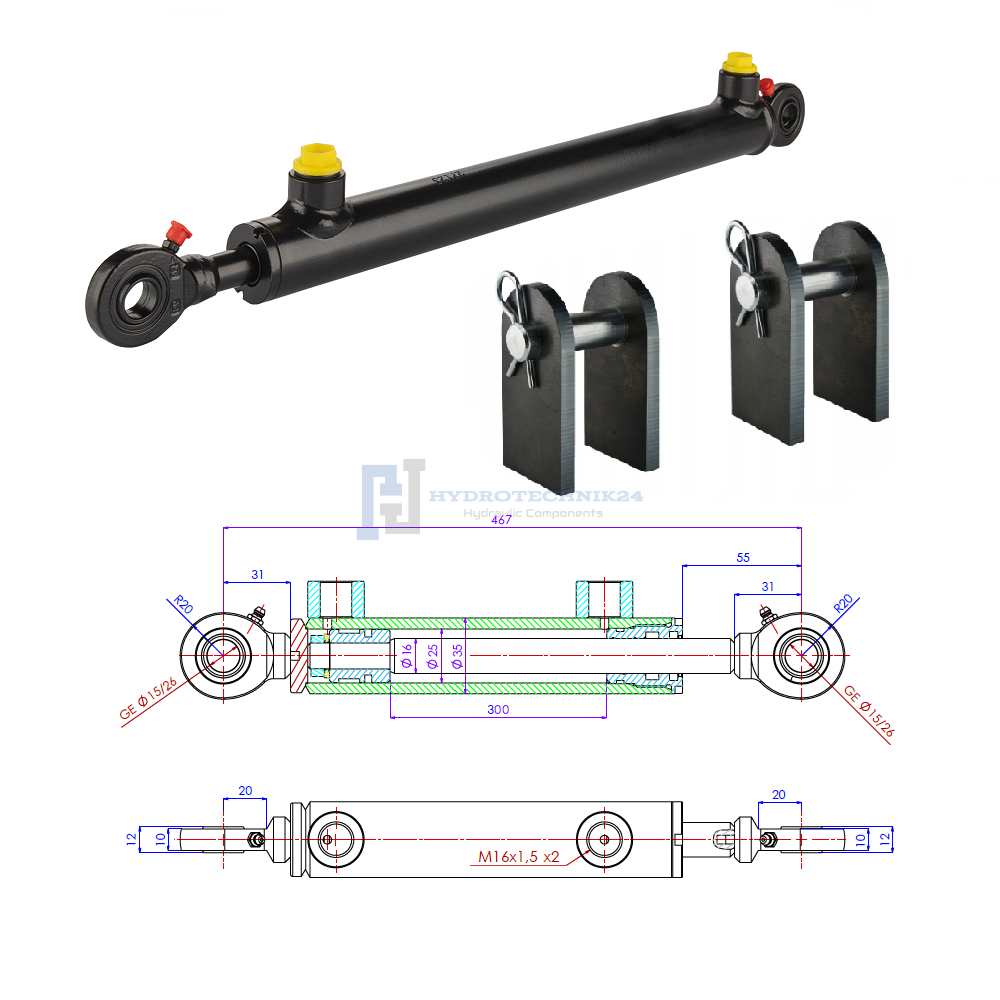 Kettős működésű hidraulikus munkahenger 25/16, hossz: 467mm lökethossz: 300mm rögzítőkonzollal