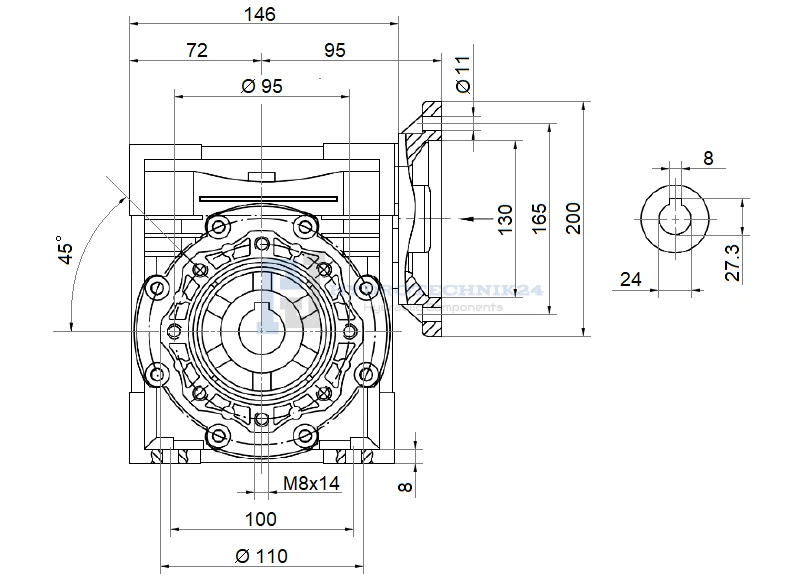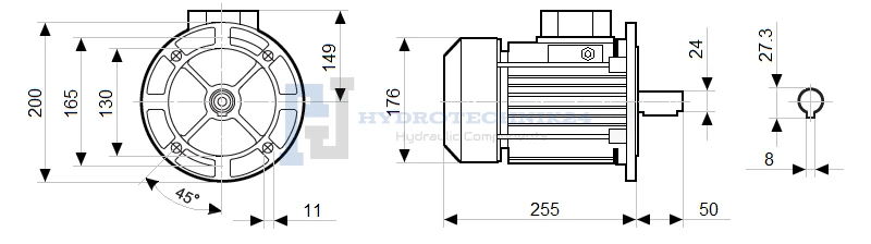Villanymotoro csigahajtóműve HMRV 63, 1:20, IEC90, háromfázisú 380V, 1,1kW, típus: B35