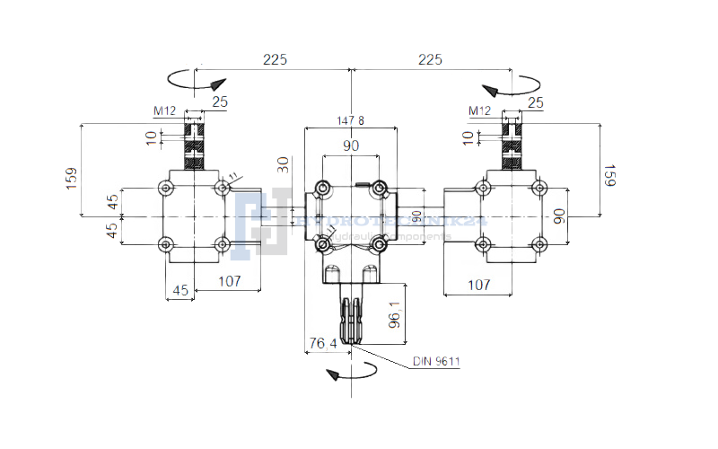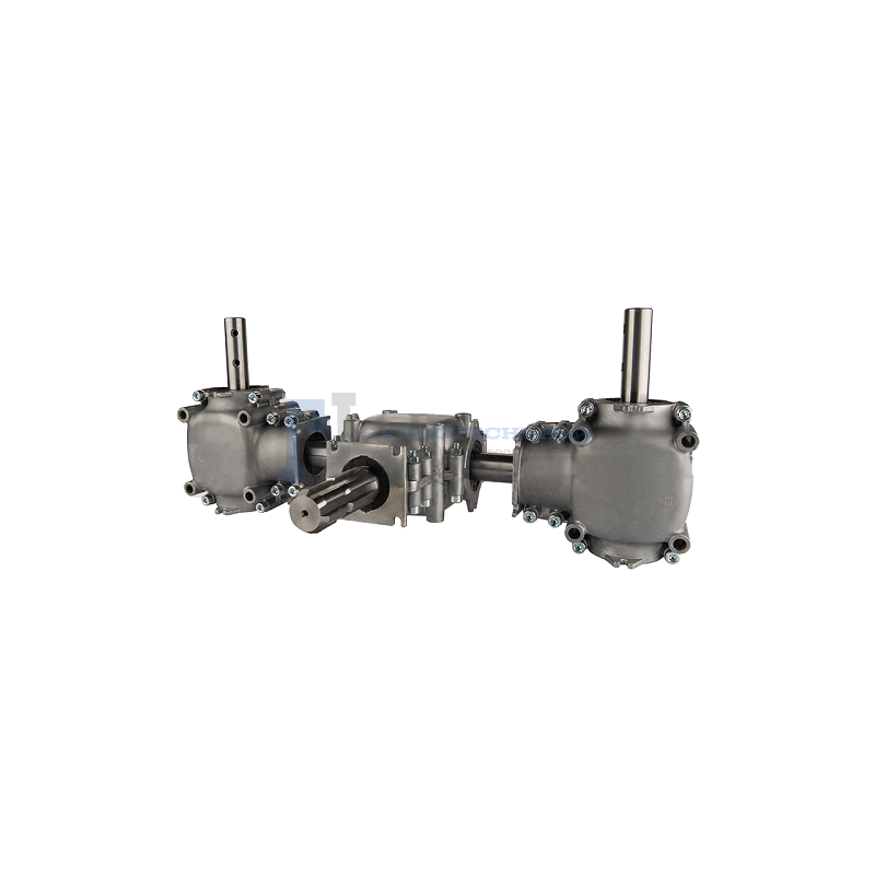 Három kúpos hajtómű egység kéttárcsás műtrágyaszóróhoz. 1:1,3 áttétellel. Tengelytávolság: 450